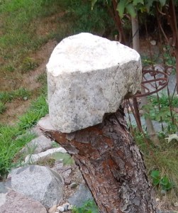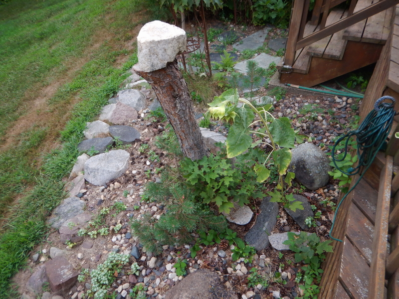 There used to be a big pine tree here. I’m guessing it might have been root bound, based on my recent discovery about the pines out in the field north of the driveway. We left it standing until it was good and dead, then I cut it down, leaving enough of the old trunk to have a nice support for a balanced rock. Using this chiseled stone for a base (probably a remnant from the construction of the field stone chimney on the house), I balanced a large rock that I was only barely able to lift up to the necessary height.
