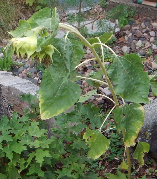 This sunflower made a surprise appearance, most likely growing from birdseed that fell from the feeder nearby. It shot up with robust energy at first. When the ground started to dry out, the growth stunted significantly. It hasn’t looked very happy ever since.