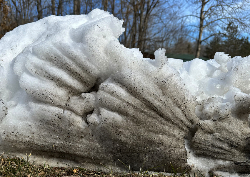 The remains of the melting plowed snow on the edge of the driveway are smeared with the dirt that got scraped up by the blade.