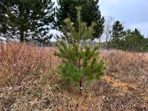 Now that we’ve found these young trees, we should probably put energy into protecting them from foraging deer. We know about “bud capping” the leader of pines with a stapled piece of paper. I would prefer that option over trying to fence around the young trees.