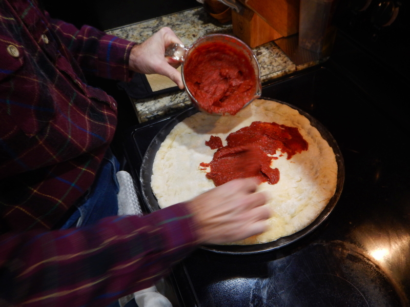 No sooner does the mix come out of the oven and Cyndie puts in a pizza crust to pre-bake.