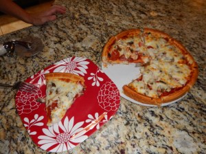 When Cyndie would come home to visit the year she worked in Boston, MA, she would order a pizza while still at the airport and pick it up on the way, carrying a fresh deep dish in the door when she arrived.