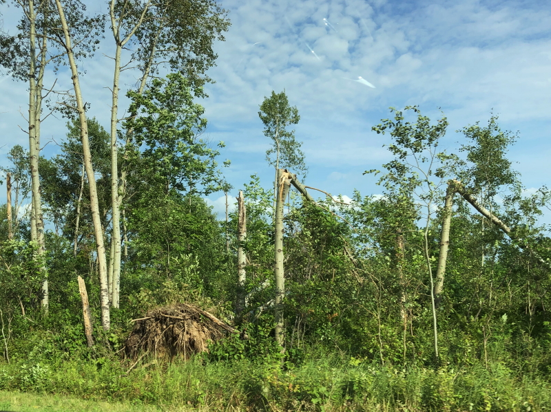 It was fruitless to try to capture a representative photo of the large scope of broken trees for miles, but I snapped a few shots on my cell phone through the car window at highway speed.