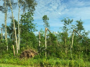 After work yesterday, Cyndie and I hopped in her car and drove up to the lake for the weekend. Leaving on a Thursday night makes for easy driving, in the absence of the typical weekend traffic headed north. Our route took us through some of the damage from last week’s storms that produced near-hurricane force winds and some baseball-sized hail.