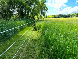 In addition to regaining the upper hand on our trails, I think I mentioned that I’ve worked some fence lines, too. Yesterday, after I got home from a successful morning of shopping, I strapped on the Stihl power trimmer and headed to the far side of the hay field to make the fence visible again.