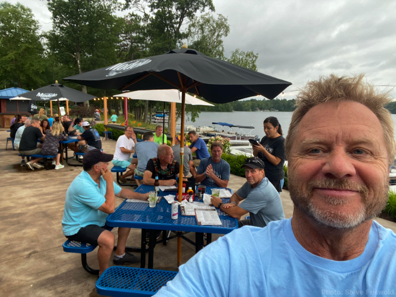 The phone-camera selfies all became “us-ies” and David K and Steve kindly shared a couple of group photos capturing the fun. The vague possibility of stopping to check out Powell’s restaurant on the far side of the lake, “maybe for a drink,” became an excuse to have dinner out.