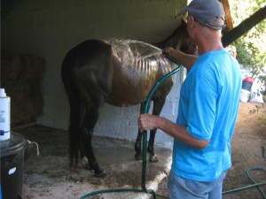 After lunch, we give the horses baths by tethering them in the grooming area, one at a time, and washing them with soap and water. They all seem to appreciate the process. After being wet, they are walked for a while to allow them to dry before putting them back in their stable. That process takes most of the afternoon and as light was getting short, we bring Cassius for a walk to show Cyndie the spring garden we had planted.