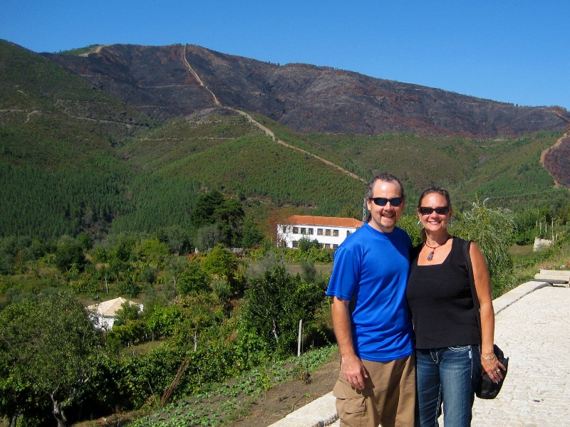 On Wednesday, we got off the farm in the afternoon and played tourist again. I’ll tell you about it next time I claim some time to write. I seem to have fallen behind a bit here, so I’ll fill in with this photo of us in front of a vista of groves and forests, some burned, on the small mountains of northern Portugal. The writing I did in my journal while on the trip contains a lot of shorthand and doesn’t read so well. I’m finding I spend a bit more time than I anticipated would be necessary to clean them up and make them ready for posting. There are just a few days of our trip left to describe. I hope to get back to the rest of our story real soon.