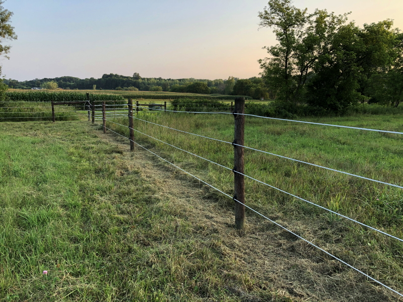 In addition to regaining the upper hand on our trails, I think I mentioned that I’ve worked some fence lines, too. Yesterday, after I got home from a successful morning of shopping, I strapped on the Stihl power trimmer and headed to the far side of the hay field to make the fence visible again.