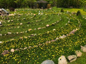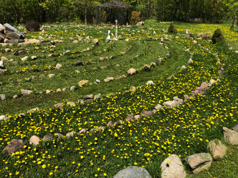 One day later, the dandelions appeared to be swallowing the labyrinth with their multiplying number beginning to cover some of the rocks defining the pathway. Yesterday afternoon I slowly walked the entire labyrinth with the power trimmer to restore order.