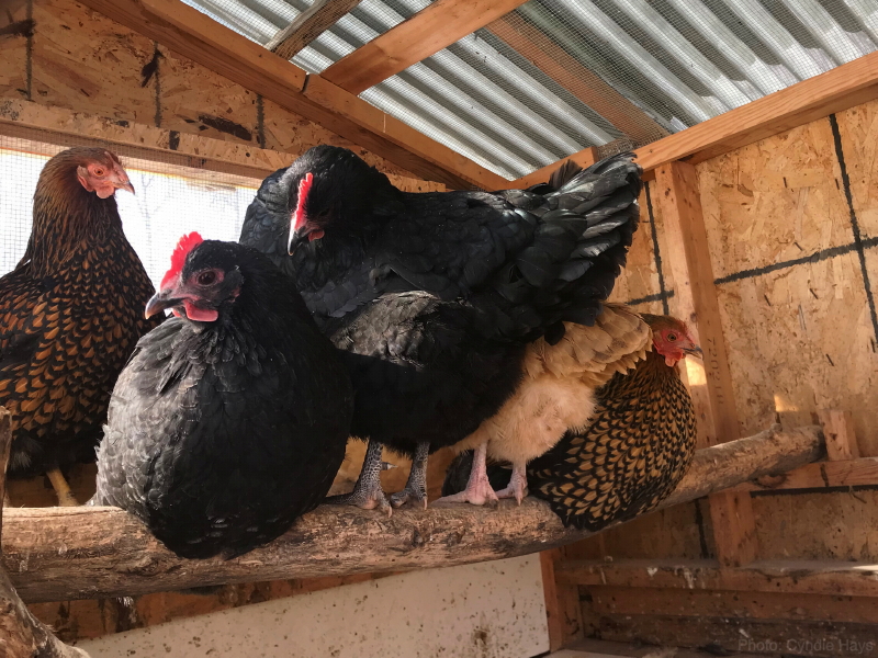 Cyndie put her back in the coop, setting her up on the roost in hopes of re-training her to not spend the nights in a nest box.