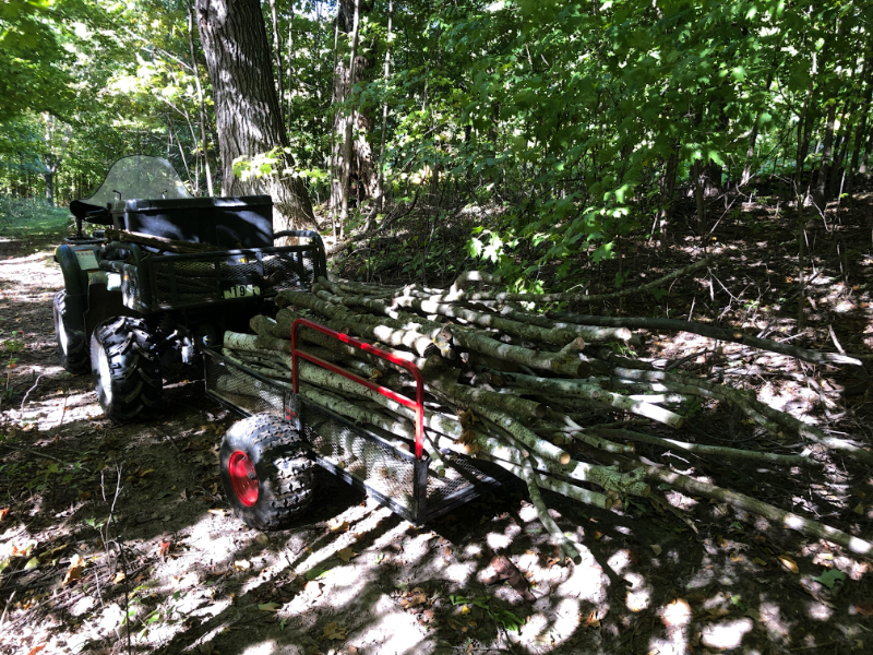 Little by little, day by day… We made another modicum of progress in dealing with the wealth of downed trees awaiting processing on our property on Thursday. I didn’t have a wasp get into my sleeve and painfully sting me four times when I grabbed a branch to put it in the ATV trailer. Cyndie can’t say the same thing.