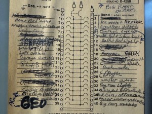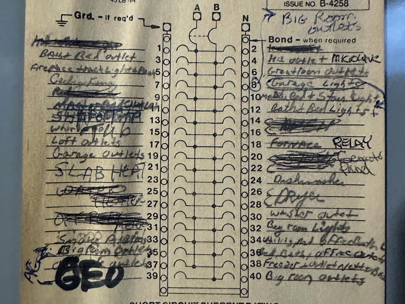 Speaking of pitiful disarray, the original electrician doing the labeling didn’t do himself proud, and every modifier since has only made things miserably worse. Part of me thinks I should have long ago cleaned up the chart with clearly legible and easily interpreted references, but a larger part of me notices we’ve gotten along well enough thus far with things just the way they are.