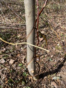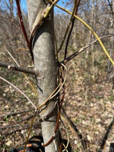 The tree above was trying to grow despite the constriction of the vine. I don’t know what kind of vine this is but it is different than the common grape vines around here that sprout little shoots to wrap around branches. This vine just grows around and around so efficiently that it is the wrap that holds tight to branches. In springtime, it is much easier to spot these vines before leaves pop out everywhere to conceal what is really going on.