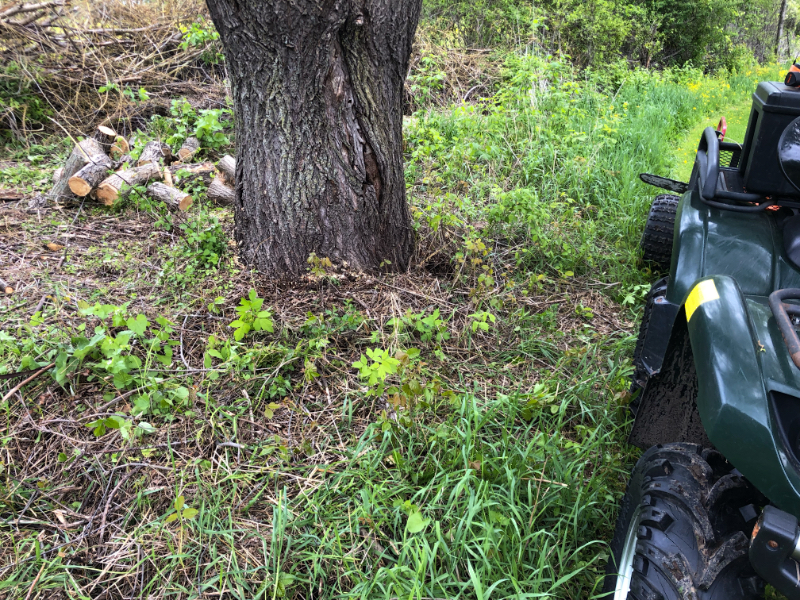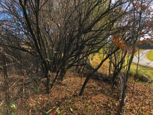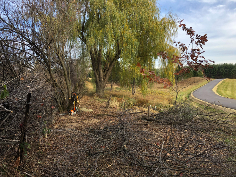 There remains a fair amount of cutting to be done to remove the last of the nannyberry behind the garden. I’m hoping nothing interrupts our plan for today to continue what we started. The sooner we complete this section, the sooner I can turn around and go the other way, cutting out the untamed growth between the garden and the shop garage.