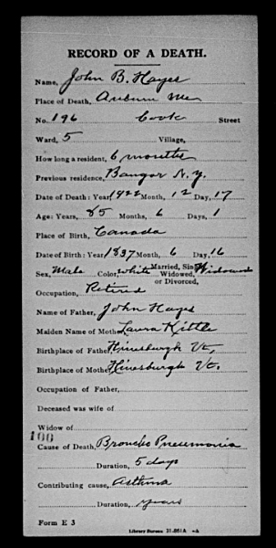 Since my search for the birth record in Hinesburg, VT of my 3rd-great grandfather John Hays (b.1795) was exclusively based on information taken from his youngest son’s death record, I decided to revisit that source death record to confirm I wasn’t misremembering anything.