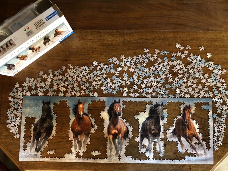 The urge has been rekindled in a big way lately. Jigsaw puzzling has become a daily craving once more. Much to both our surprise, Cyndie has picked up the bug as much as I and for the first time in all our years together, we are sharing the joys of assembling the scattered pieces.