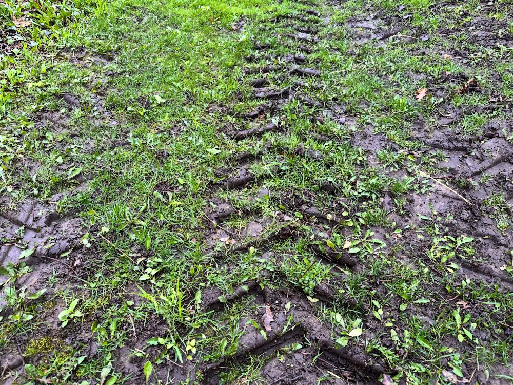 I found skid marks in the big paddock that revealed one of the horses slid on all four hooves for a length of about four feet. I assume one of them had started to bolt and then tried to slam on the brakes. Thank goodness they all looked fine when we arrived to serve their evening feed.