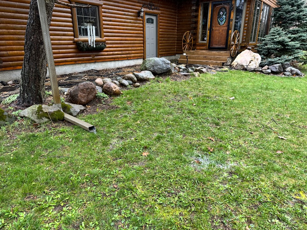 A puddle was almost forming in the grass beyond the outlet of the last stretch of the downspout. That is water that would have been soaking into the dirt along the foundation from the ineffective (broken) plastic solution that had previously been in place for years.