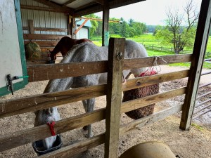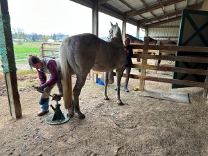We received rain in several waves that lived up to the weather forecast for yesterday. Despite the precipitation, we pulled off a few good projects on our to-do list for this week. First off, the horses had a morning appointment with the farrier.