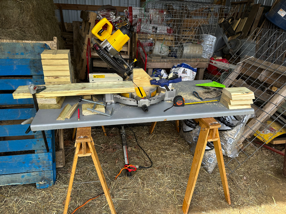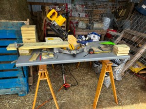 For my next project, I decided to set up under the hay shed roof to cut some blocks of wood for the shade sail posts going into the ground.