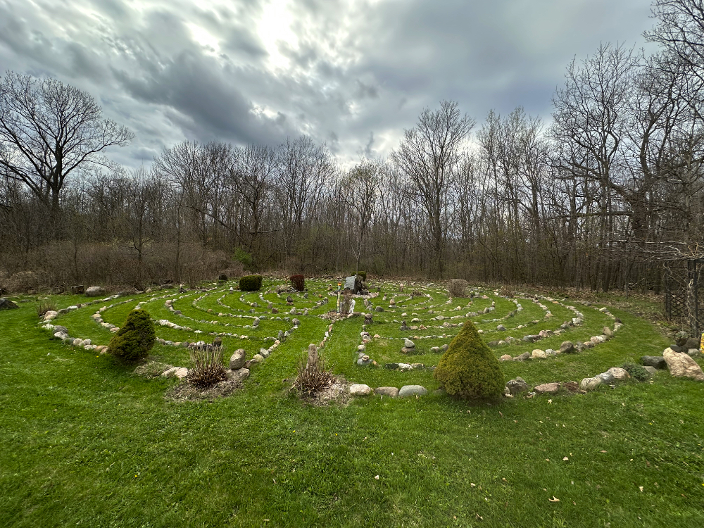 For the first time in several years, we are expecting a dry, sunny day for World Labyrinth Day tomorrow. We are not in the best climate zone to show off our Forest Garden Labyrinth in early May, but we make due. It’s a little like having a flower show without any flowers. That doesn’t mean a person can’t enjoy taking a meandering stroll down the curving path while meditating on global peace, but it would be that much more inspiring to have leaves on the branches and flowers on stems.