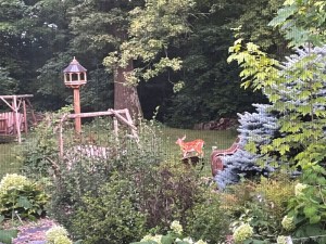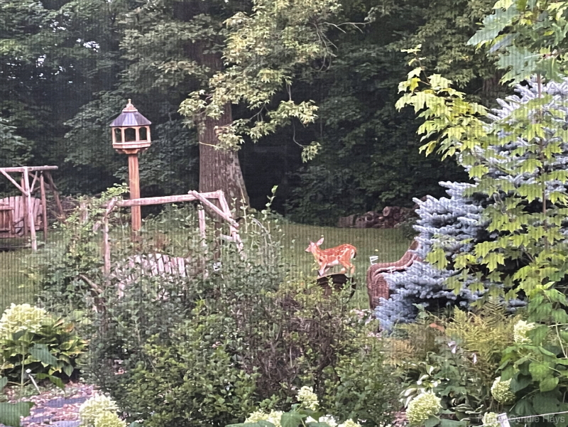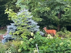 Yesterday morning, first thing, Cyndie reported seeing a momma deer and two fawns out our bedroom window. I was just commenting the other day that there was no sign of any nibbling of our hostas back there this summer. I didn’t check yet to see if that still holds true.