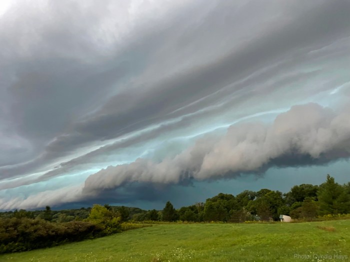 Cyndie was out walking Delilah on our north loop trail near the road when she captured this dramatic view of yesterday mornings’ approaching thunderstorm.