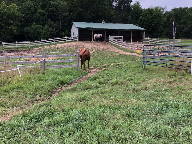 They were standing around in their usual space under the overhang when Cyndie and I wandered out into the hayfield while coaxing them to join us. Mia quickly made her way after us but paused at the gate.