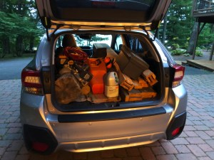 I loaded up the Crosstrek with more lumber and a few tools after work yesterday and headed north with the goal of finally beginning the assembly of the pieces cut at home to build a cute little firewood storage shed at the lake place.