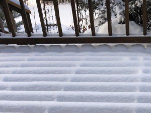 There is an interesting result of the snow being such light powder that fell in tiny flakes visible beneath our deck railing.