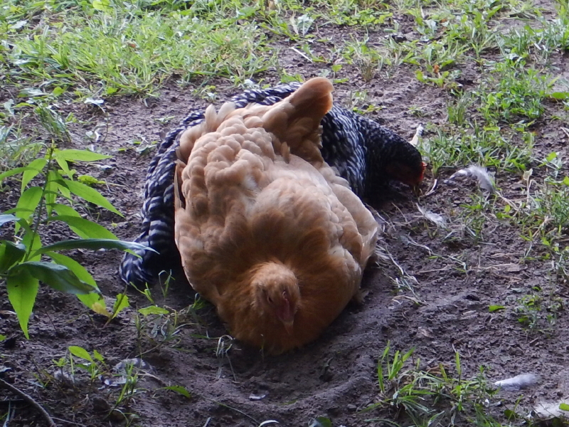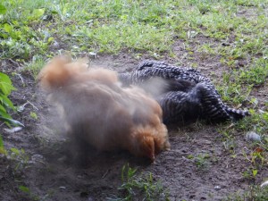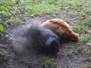 While I was busy sprucing up the property, the chickens were sprucing up themselves with a rousing dust bath yesterday afternoon. Apparently, two of them had simultaneous interest in the exact same spot of sandy ground. If it hadn’t been for their two different colors, I wouldn’t have been able to tell where one left off and the other started.