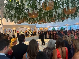 All the while, the band was expertly serenading diners as they enjoyed their meals, and the bride and groom worked their way around each table to personally greet everyone who had come. After the traditional series of sentimental first dances, the band revved things back into high gear, and the high-octane dancing picked up where it left off before the food was served.