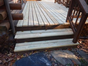 Blessed with another glorious day of blue sky and sunshine on a Friday, Cyndie and I returned to the deck refurbishing project yesterday. The temperature was a little harsh at the start but soon warmed to perfection. Even after I had removed all the screws from the set of steps we started on, I couldn’t get the boards loose until I figured out they were frozen in place. A little persuasion from a hammer was all it took to break the ice.