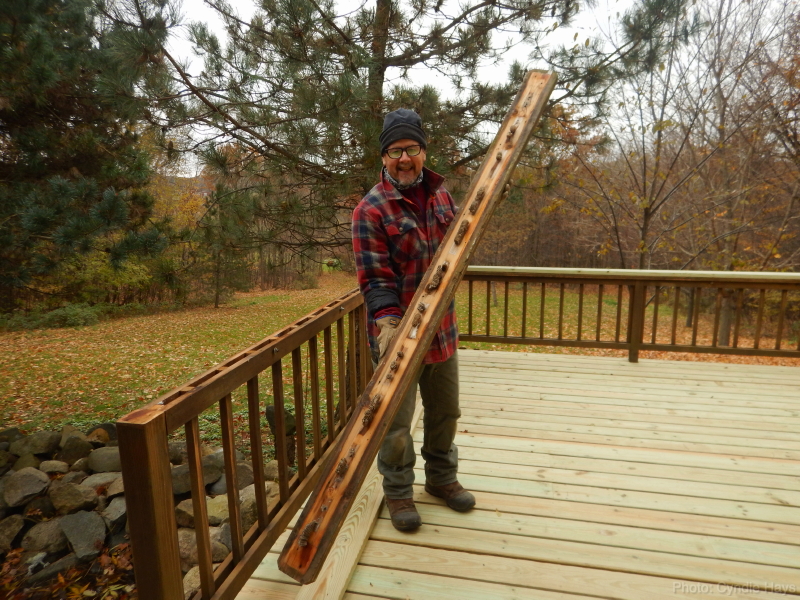 I pulled screws out of the old boards yesterday morning and installed the new boards in the afternoon. When I lifted the first board off the railing, we made a startling discovery.
