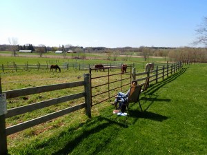 On their second day with us, the horses showed another side of themselves. After they had their morning feed, Cyndie sat with them as they took some naps and generally lounged around the paddock.