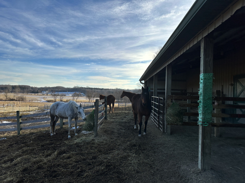 We drove home in the afternoon and found a similar amount of light snow covering our property as there was up north. The horses all looked well and the barn appeared orderly after several days of a volunteer doing the feedings for us.