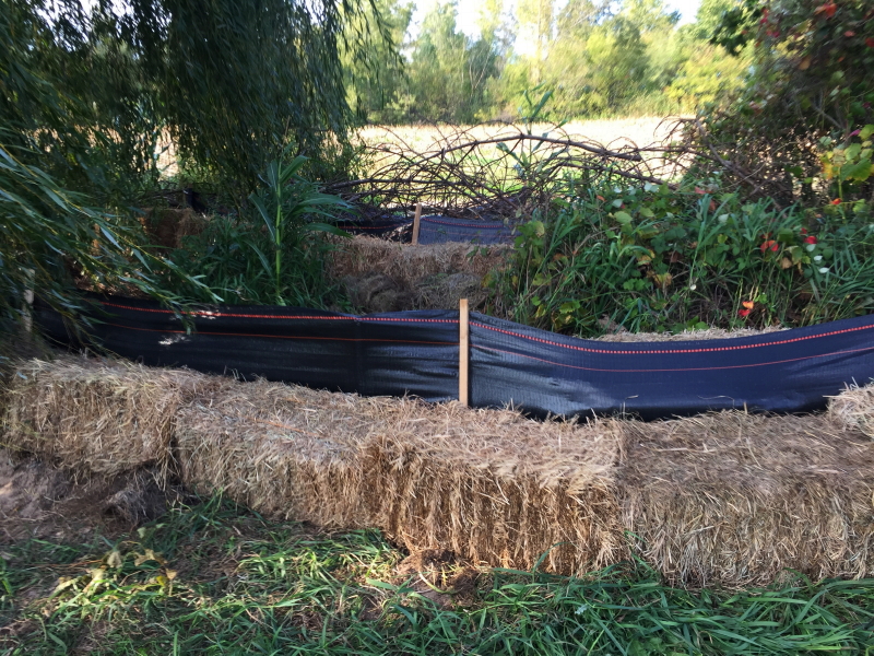 We have added support to the fabric fence by using old hay bales that we can’t feed to the horses because they have gotten moldy.