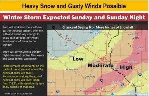 The snow is predicted to come in a narrow band, so it could shift a little, but we are located perilously close to the highest risk of seeing 6 or more inches of snowfall. Look to the right of the letter “e” in the word Moderate, just above Red Wing. Oh, joy.