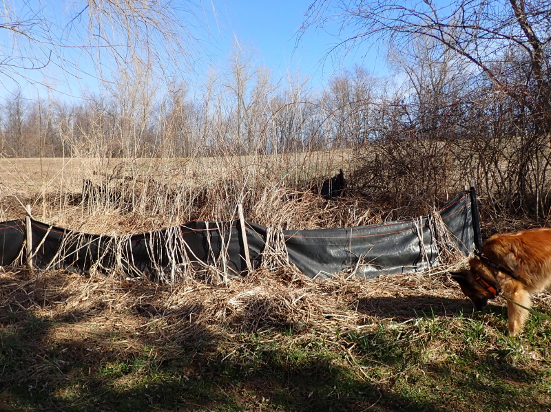 I spent yesterday tinkering with the slowly developing berm we are constructing at the edge of our property where the neighboring cultivated farm field drains onto our land. It’s been 2-and-a-half years since we installed the latest version of erosion fencing and much of that has filled with so much topsoil the fabric is laying almost flat in some places.