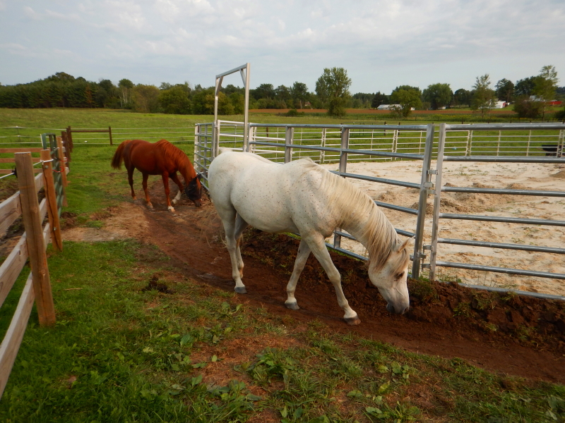 We had fun in our giant sand box yesterday. The round pen has not had consistent attention this summer which has given the grass a chance to become a little too prominent a feature. The horses get confused over whether they are supposed to be exercising or eating.