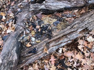 Asher and I picked a spot to position the trail cam (which has been in storage [with batteries still in it. Boo!] for too long), hoping to identify what animal has been using an old downed tree trunk in our woods for its toilet. My scat-identifying skills have me thinking it looks like either a human or a dog as big or bigger than Asher. In reality, based on likely creatures traveling in that part of the forest, it’s a coyote, fox, or really large raccoon. Whatever it is, the amount of scat reveals this is a regular occurrence and not just an animal that happened to be wandering past.