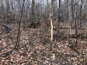 Given the relatively long span of time with no snowfall, getting off the trails to explore our woods has proved revealing of late. Delilah and I came upon at least three hazardous waste sites. Me suspects the local raccoons have a luxurious condominium in the trees above this spot.