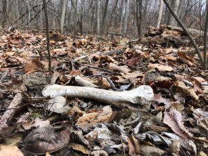 As we made our way down a slope where Delilah raced ahead while I scrambled to navigate the leash, and my body, around and under the tree debris she wove through, I thought I saw a big squirrel on the ground ahead. When Delilah ignored it and passed by in pursuit of a fresher scent, I saw that it was simply a long ago dried out scrap of furry hide from what I guessed to be a deer.