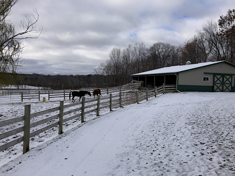 This year’s initiation to snow cover came gently and during the weekend, causing minimal impact to our routine. We aren’t sure about the history of our horses’ experience with snow but there was no indication they were the least bit disturbed by the arrival of whiteness.