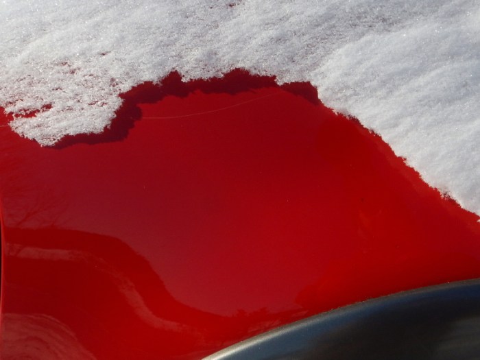 I love how the snow looks so much like paper or felt. The roll of the lower left reflection that flows similar to the broken edge of the snow. The compliment of the contrasting black trim. How the shadow reveals the space between the snow and truck surface.