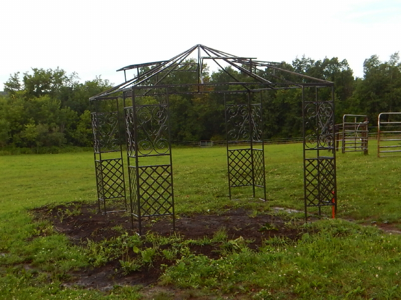 To our joint surprise, as we came around the woods and the new gazebo frame came into view, it looked exactly like the way we left it last night. It survived its first test with an excellent result.