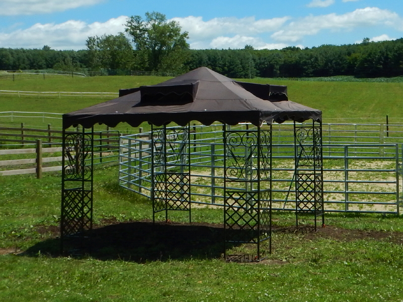 Knowing we had an appointment scheduled for George to trim the horse’s hooves at noon, I chose to dip into a project down at the barn, finally assembling the shade gazebo that we purchased over a year ago. I threaded nuts on bolts for hours on end throughout the intense afternoon heat.