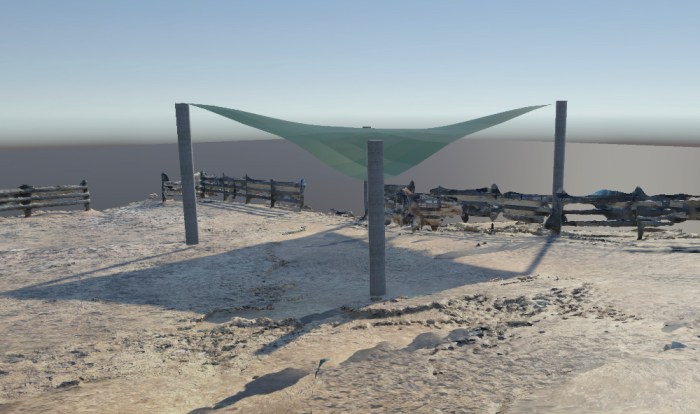 My exercise of mulling ideas over in my head for days on end brought me to a lightbulb moment when contemplating how a shade sail might work for our horses in the small paddock. How might I simulate what it will look like in order to figure out an optimal size and location? In my head, I’ve been troubling over the lack of a single defined parameter. Too many moving parts.