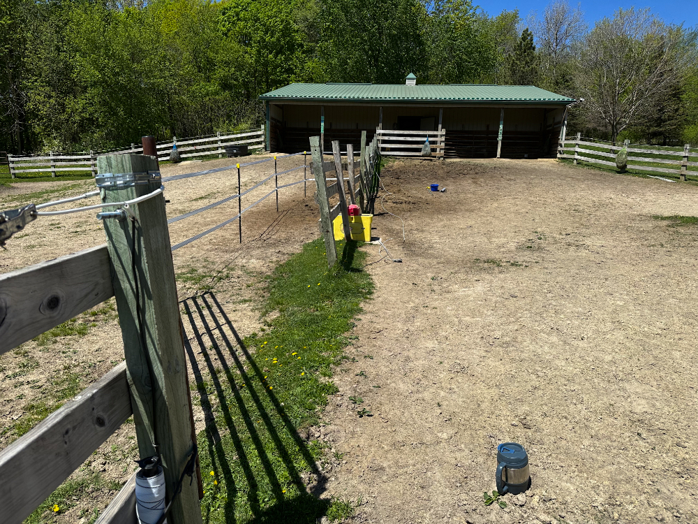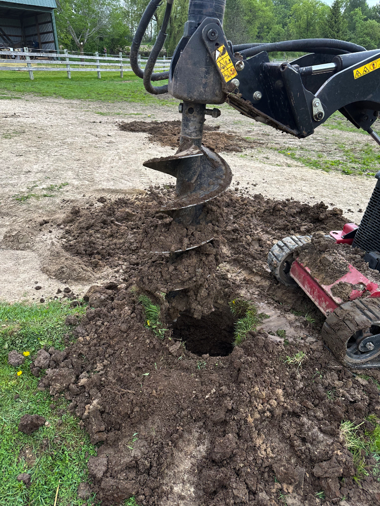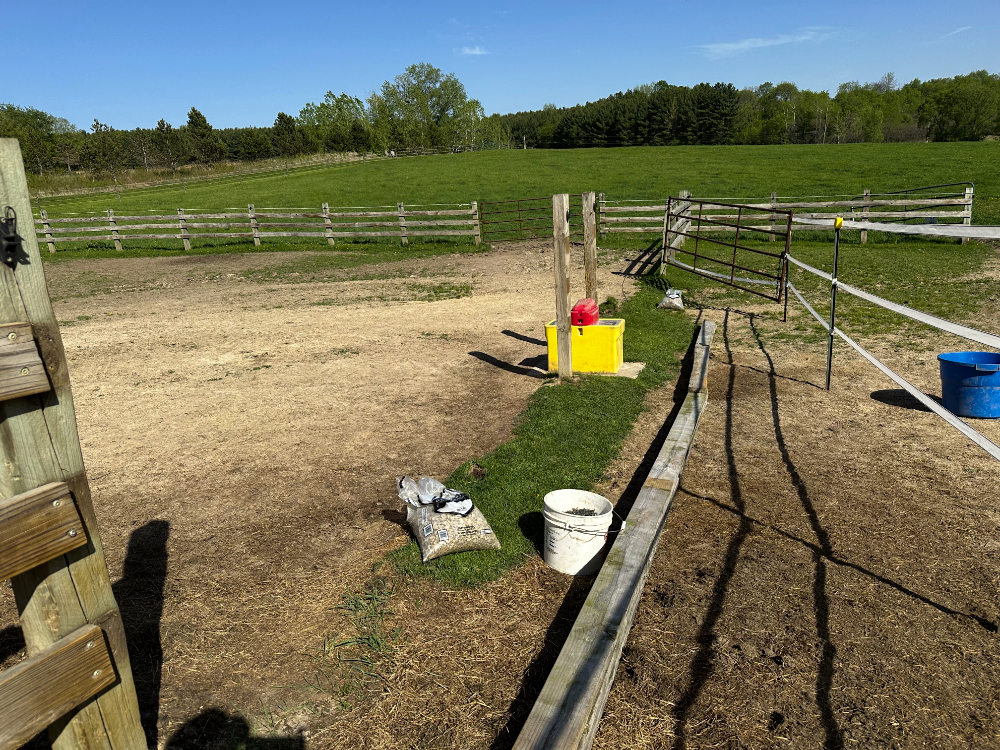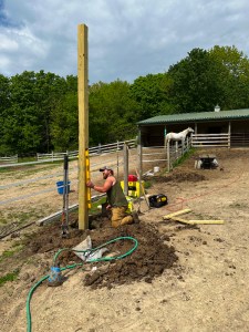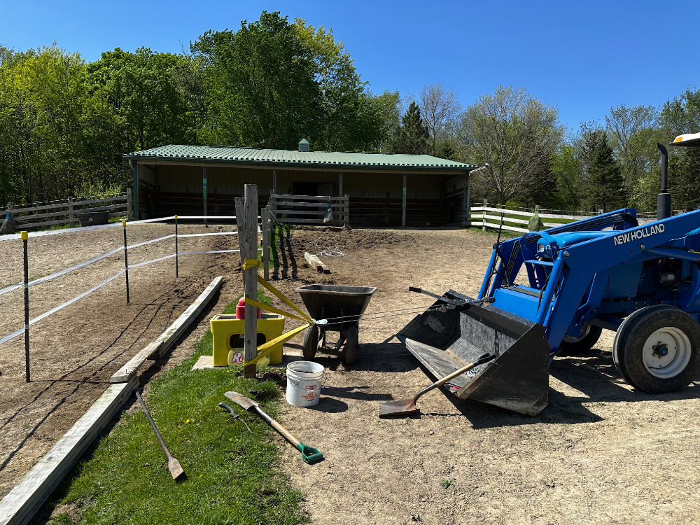 We are down to the last preparation steps before erecting four new shade sail posts. I have been holding off from doing this work because we wanted to minimize the disruption to the horses’ normal routine. Since they appear to be coping just fine with the changes I’ve made prior to yesterday, Cyndie agreed we could temporarily relocate where we hang their feed buckets. That meant I would no longer need the hoakie fence I put up a few days ago, and instead close off the small paddock entirely.